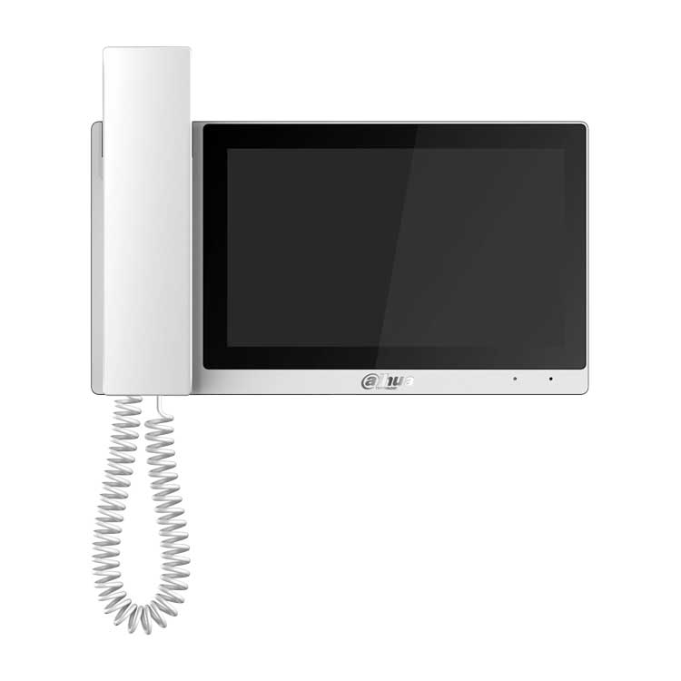 Монитор видеодомофона IP 7-и дюймовый с WiFi 2.4ГГц, с трубкой, черный/белый 1024x600 разрешение, ёмкостной сенсорный экран; тревожные входы / выходы 6/1; RS485; LAN; поддержка micro-SD до 32Гб; Возможность просмотра IP видеокамер; Питание: DC 12В/PoE(802.3af); Габаритные размеры: 236 мм × 129,8 мм × 23 мм; Установка - на стену/на стол.