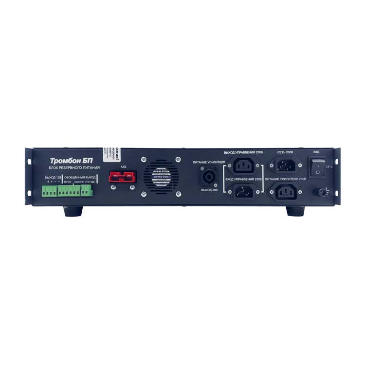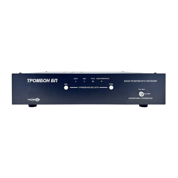 Обновленный блок резервного питания «Тромбон БП-14» обеспечивает бесперебойным низковольтным электропитанием (коммутируемое 24-28В/14А, постоянное 24-28В/2А и постоянное 12В/2А) усилители мощности и другие технические средства, такие как световые эвакуационные знаки безопасности, электромагнитные замки дверей эвакуационных выходов, звуковые излучатели, генераторы сирены и т.д.